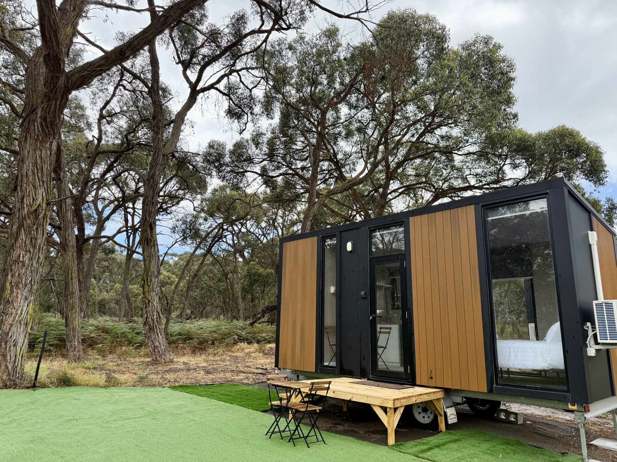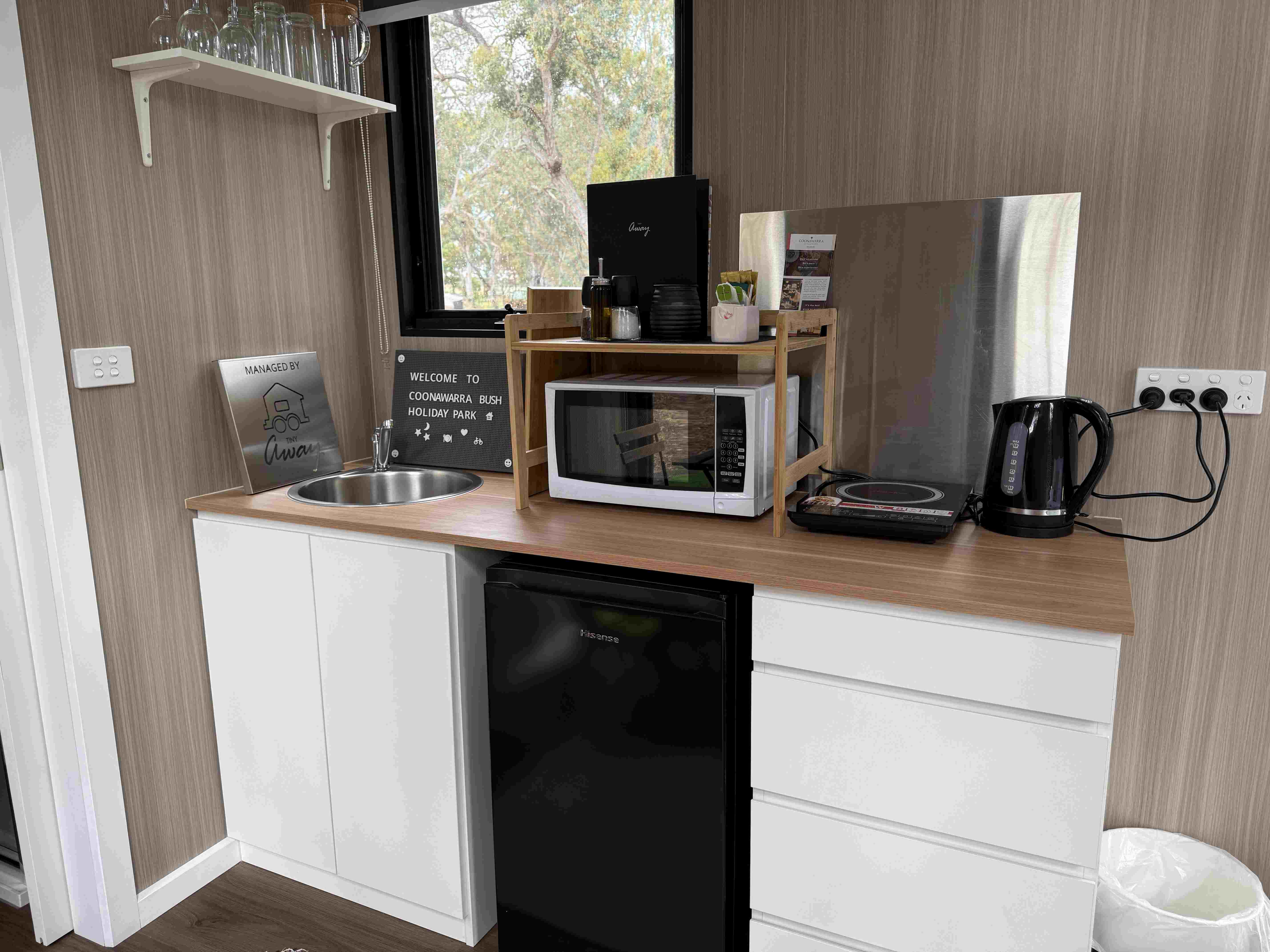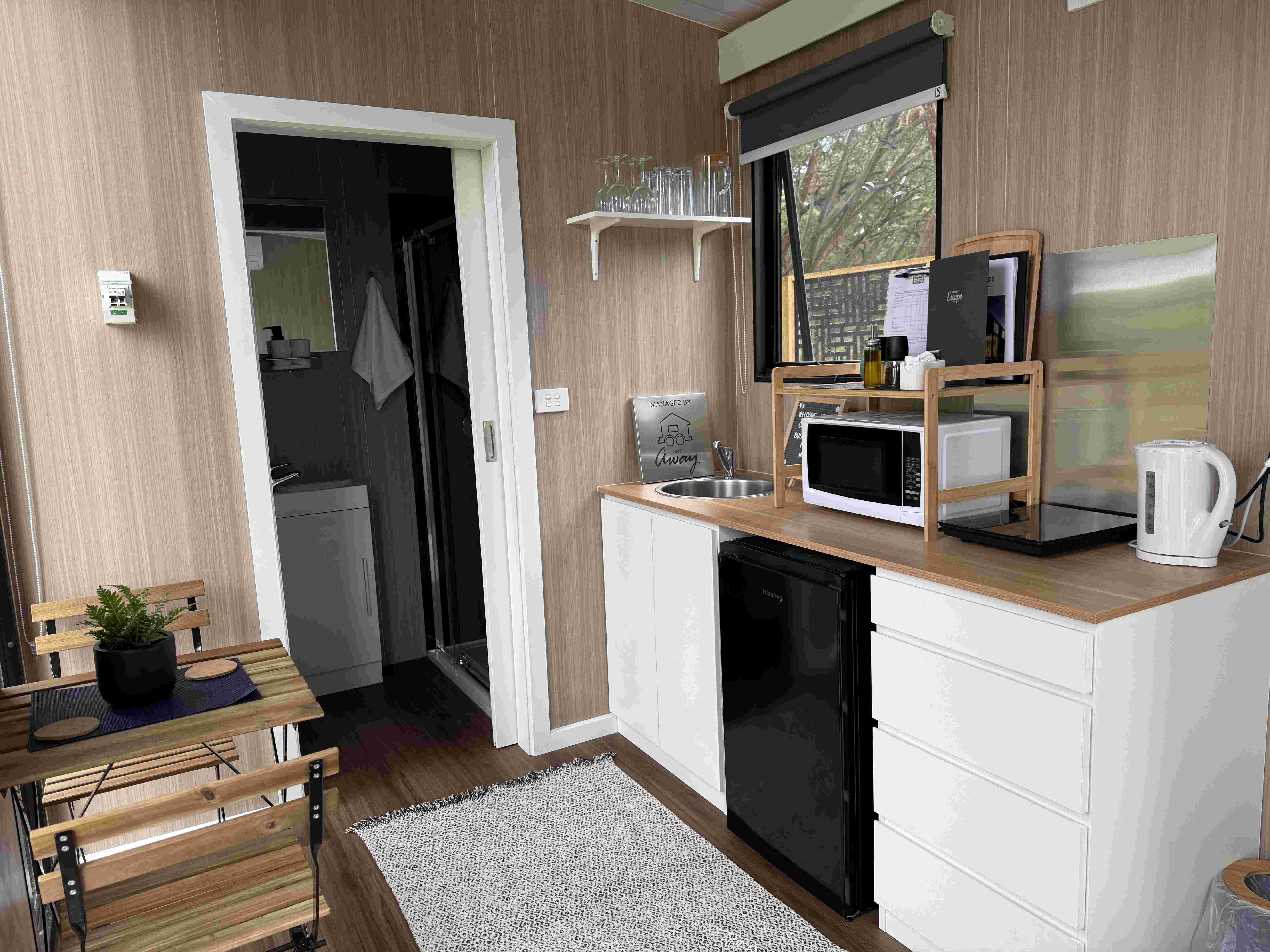 The two Bush Hideaways at Coonawarra Bush Holiday Park offer a peaceful retreat in Coonawarra, Australia. Our tiny houses are set in a secluded space with the perfect balance of comfort and tranquility. Air conditioning, heating, full bathroom, kitchenette, tea and coffee included. Fire drum and picnic table outside.